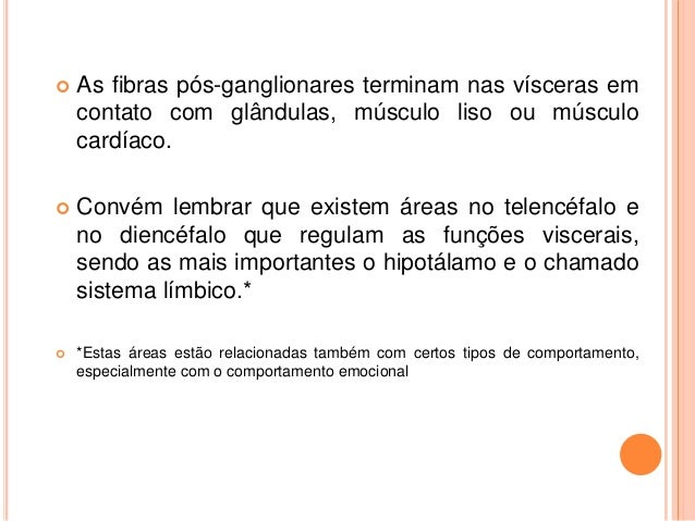 17. 17.  As fibras pós-ganglionares terminam nas vísceras em contato com glândulas, músculo liso ou músculo cardíaco.  Convém lembrar que existem áreas no telencéfalo e no diencéfalo que regulam as funções viscerais, sendo as mais importantes o hipotálamo e o chamado sistema límbico.*  *Estas áreas estão relacionadas também com certos tipos de comportamento, especialmente com o comportamento emocional