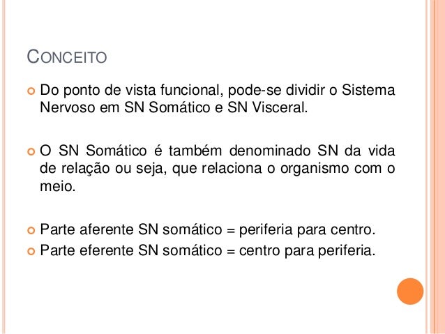 2. 2. CONCEITO  Do ponto de vista funcional, pode-se dividir o Sistema Nervoso em SN Somático e SN Visceral.  O SN Somático é também denominado SN da vida de relação ou seja, que relaciona o organismo com o meio.  Parte aferente SN somático = periferia para centro.  Parte eferente SN somático = centro para periferia.