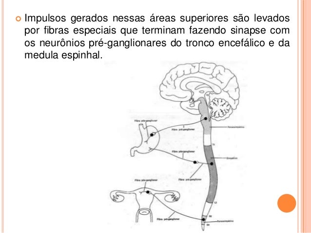 18. 18.  Impulsos gerados nessas áreas superiores são levados por fibras especiais que terminam fazendo sinapse com os neurônios pré-ganglionares do tronco encefálico e da medula espinhal.