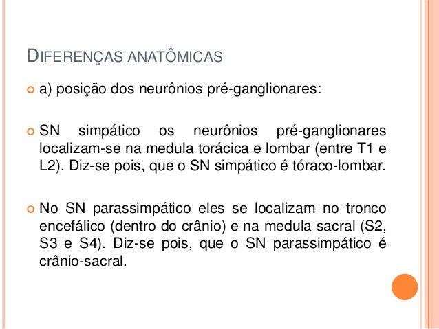 21. 21. DIFERENÇAS ANATÔMICAS  a) posição dos neurônios pré-ganglionares:  SN simpático os neurônios pré-ganglionares localizam-se na medula torácica e lombar (entre T1 e L2). Diz-se pois, que o SN simpático é tóraco-lombar.  No SN parassimpático eles se localizam no tronco encefálico (dentro do crânio) e na medula sacral (S2, S3 e S4). Diz-se pois, que o SN parassimpático é crânio-sacral.