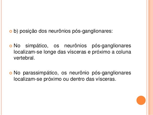 22. 22.  b) posição dos neurônios pós-ganglionares:  No simpático, os neurônios pós-ganglionares localizam-se longe das vísceras e próximo a coluna vertebral.  No parassimpático, os neurônio pós-ganglionares localizam-se próximo ou dentro das vísceras.