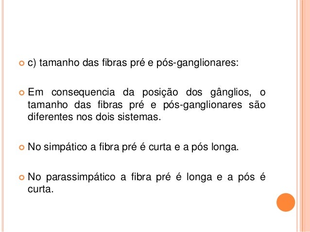 23. 23.  c) tamanho das fibras pré e pós-ganglionares:  Em consequencia da posição dos gânglios, o tamanho das fibras pré e pós-ganglionares são diferentes nos dois sistemas.  No simpático a fibra pré é curta e a pós longa.  No parassimpático a fibra pré é longa e a pós é curta.
