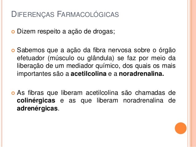 24. 24. DIFERENÇAS FARMACOLÓGICAS  Dizem respeito a ação de drogas;  Sabemos que a ação da fibra nervosa sobre o órgão efetuador (músculo ou glândula) se faz por meio da liberação de um mediador químico, dos quais os mais importantes são a acetilcolina e a noradrenalina.  As fibras que liberam acetilcolina são chamadas de colinérgicas e as que liberam noradrenalina de adrenérgicas.