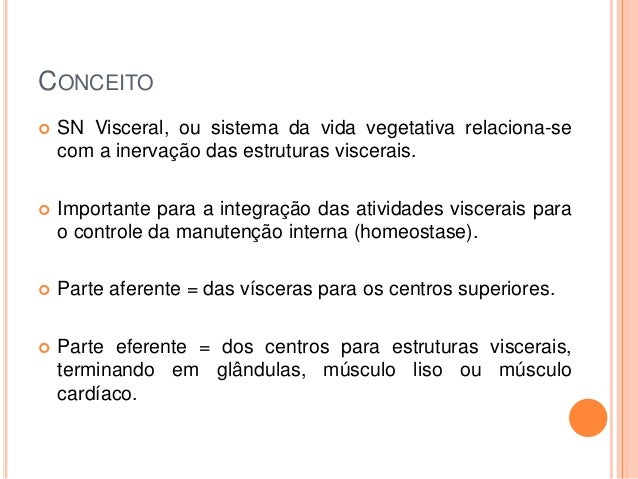3. 3. CONCEITO  SN Visceral, ou sistema da vida vegetativa relaciona-se com a inervação das estruturas viscerais.  Importante para a integração das atividades viscerais para o controle da manutenção interna (homeostase).  Parte aferente = das vísceras para os centros superiores.  Parte eferente = dos centros para estruturas viscerais, terminando em glândulas, músculo liso ou músculo cardíaco.
