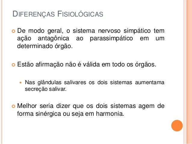 27. 27. DIFERENÇAS FISIOLÓGICAS  De modo geral, o sistema nervoso simpático tem ação antagônica ao parassimpático em um determinado órgão.  Estão afirmação não é válida em todo os órgãos.  Nas glândulas salivares os dois sistemas aumentama secreção salivar.  Melhor seria dizer que os dois sistemas agem de forma sinérgica ou seja em harmonia.