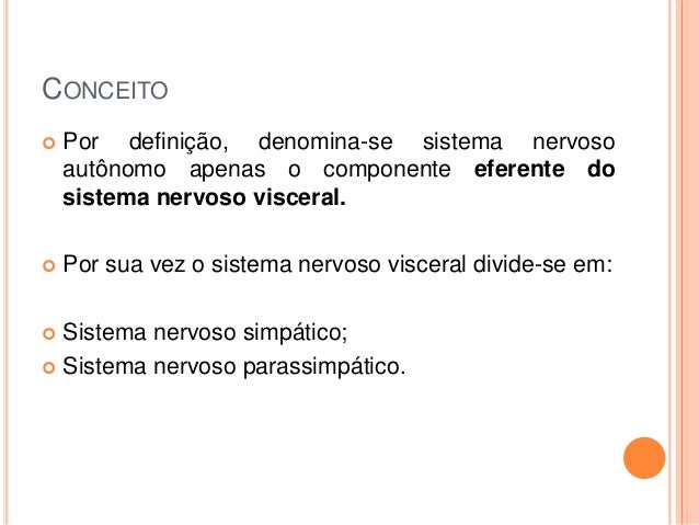 4. 4. CONCEITO  Por definição, denomina-se sistema nervoso autônomo apenas o componente eferente do sistema nervoso visceral.  Por sua vez o sistema nervoso visceral divide-se em:  Sistema nervoso simpático;  Sistema nervoso parassimpático.