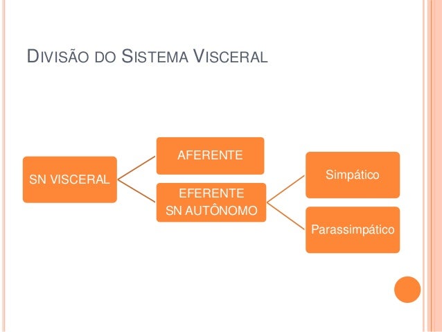 5. 5. DIVISÃO DO SISTEMA VISCERAL SN VISCERAL AFERENTE EFERENTE SN AUTÔNOMO Simpático Parassimpático