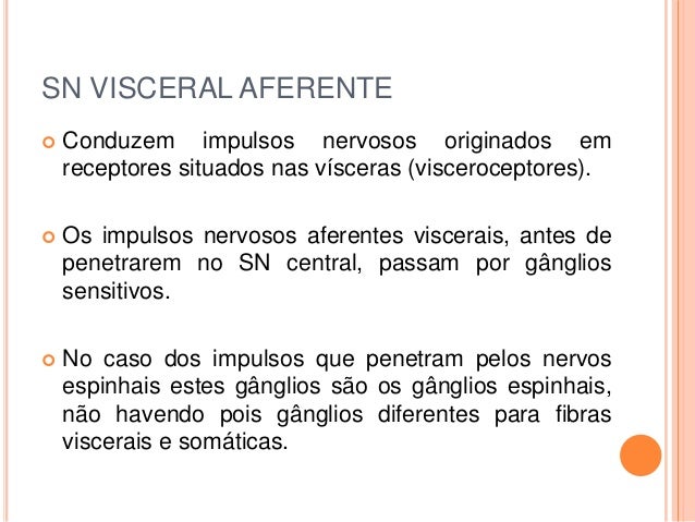 6. 6. SN VISCERAL AFERENTE  Conduzem impulsos nervosos originados em receptores situados nas vísceras (visceroceptores).  Os impulsos nervosos aferentes viscerais, antes de penetrarem no SN central, passam por gânglios sensitivos.  No caso dos impulsos que penetram pelos nervos espinhais estes gânglios são os gânglios espinhais, não havendo pois gânglios diferentes para fibras viscerais e somáticas.