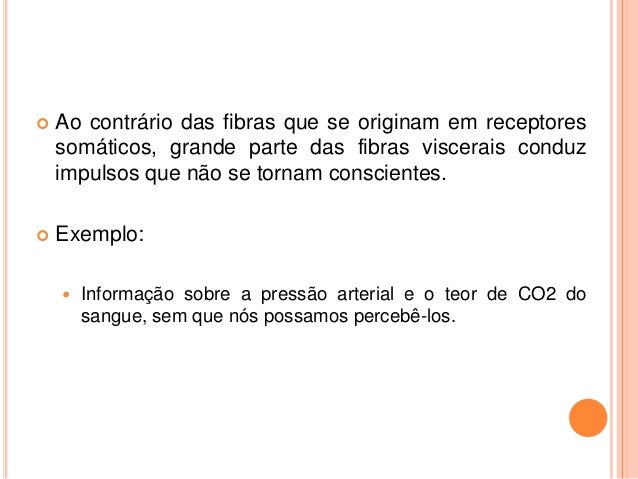 7. 7.  Ao contrário das fibras que se originam em receptores somáticos, grande parte das fibras viscerais conduz impulsos que não se tornam conscientes.  Exemplo:  Informação sobre a pressão arterial e o teor de CO2 do sangue, sem que nós possamos percebê-los.