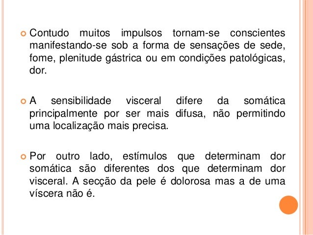 8. 8.  Contudo muitos impulsos tornam-se conscientes manifestando-se sob a forma de sensações de sede, fome, plenitude gástrica ou em condições patológicas, dor.  A sensibilidade visceral difere da somática principalmente por ser mais difusa, não permitindo uma localização mais precisa.  Por outro lado, estímulos que determinam dor somática são diferentes dos que determinam dor visceral. A secção da pele é dolorosa mas a de uma víscera não é.