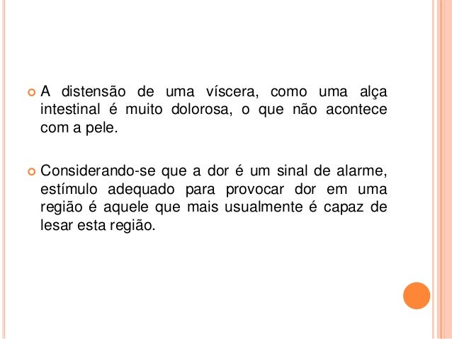 9. 9.  A distensão de uma víscera, como uma alça intestinal é muito dolorosa, o que não acontece com a pele.  Considerando-se que a dor é um sinal de alarme, estímulo adequado para provocar dor em uma região é aquele que mais usualmente é capaz de lesar esta região.
