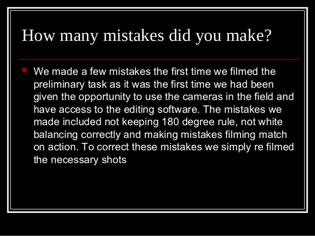 2. 2. How many mistakes did you make?  We made a few mistakes the first time we filmed the preliminary task as it was the first time we had been given the opportunity to use the cameras in the field and have access to the editing software. The mistakes we made included not keeping 180 degree rule, not white balancing correctly and making mistakes filming match on action. To correct these mistakes we simply re filmed the necessary shots