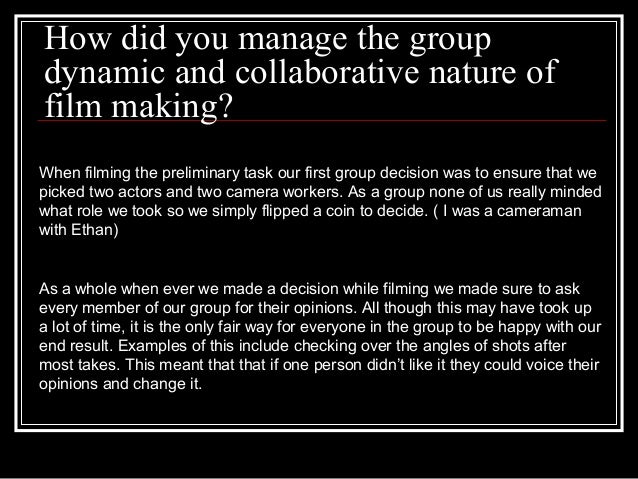3. 3. How did you manage the group dynamic and collaborative nature of film making? When filming the preliminary task our first group decision was to ensure that we picked two actors and two camera workers. As a group none of us really minded what role we took so we simply flipped a coin to decide. ( I was a cameraman with Ethan) As a whole when ever we made a decision while filming we made sure to ask every member of our group for their opinions. All though this may have took up a lot of time, it is the only fair way for everyone in the group to be happy with our end result. Examples of this include checking over the angles of shots after most takes. This meant that that if one person didn’t like it they could voice their opinions and change it.