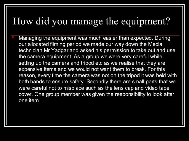 4. 4. How did you manage the equipment?  Managing the equipment was much easier than expected. During our allocated filming period we made our way down the Media technician Mr Yadgar and asked his permission to take out and use the camera equipment. As a group we were very careful while setting up the camera and tripod etc as we realise that they are expensive items and we would not want them to break. For this reason, every time the camera was not on the tripod it was held with both hands to ensure safety. Secondly there are small parts that we were careful not to misplace such as the lens cap and video tape cover. One group member was given the responsibility to look after one item