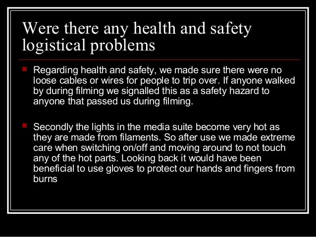 6. 6. Were there any health and safety logistical problems  Regarding health and safety, we made sure there were no loose cables or wires for people to trip over. If anyone walked by during filming we signalled this as a safety hazard to anyone that passed us during filming.  Secondly the lights in the media suite become very hot as they are made from filaments. So after use we made extreme care when switching on/off and moving around to not touch any of the hot parts. Looking back it would have been beneficial to use gloves to protect our hands and fingers from burns