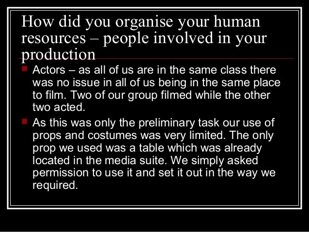 7. 7. How did you organise your human resources – people involved in your production   Actors – as all of us are in the same class there was no issue in all of us being in the same place to film. Two of our group filmed while the other two acted. As this was only the preliminary task our use of props and costumes was very limited. The only prop we used was a table which was already located in the media suite. We simply asked permission to use it and set it out in the way we required.