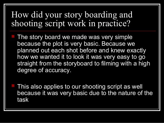 8. 8. How did your story boarding and shooting script work in practice?  The story board we made was very simple because the plot is very basic. Because we planned out each shot before and knew exactly how we wanted it to look it was very easy to go straight from the storyboard to filming with a high degree of accuracy.  This also applies to our shooting script as well because it was very basic due to the nature of the task