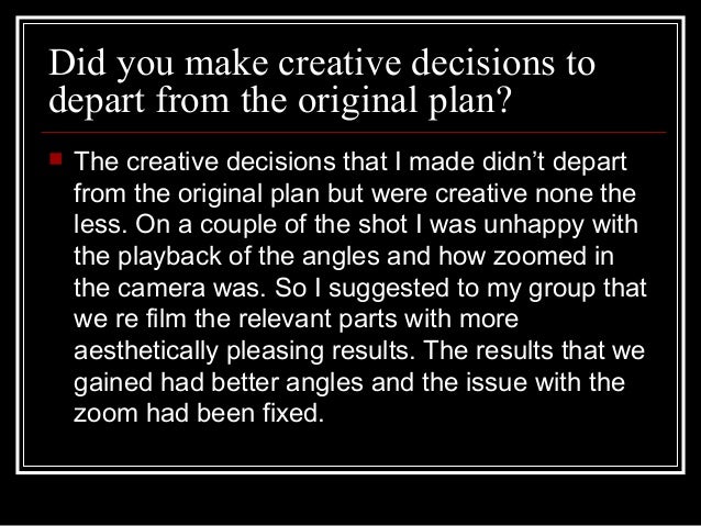 9. 9. Did you make creative decisions to depart from the original plan?  The creative decisions that I made didn’t depart from the original plan but were creative none the less. On a couple of the shot I was unhappy with the playback of the angles and how zoomed in the camera was. So I suggested to my group that we re film the relevant parts with more aesthetically pleasing results. The results that we gained had better angles and the issue with the zoom had been fixed.