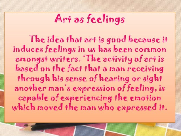 8. 8. Art as feelings The idea that art is good because it induces feelings in us has been common amongst writers. ‘The activity of art is based on the fact that a man receiving through his sense of hearing or sight another man’s expression of feeling, is capable of experiencing the emotion which moved the man who expressed it.