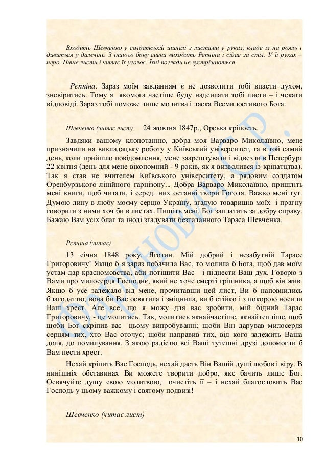 10. 10. Входить Шевченко у солдатській шинелі з листами у руках, кладе їх на рояль і дивиться у далечінь. З іншого боку сцени виходить Рєпніна і сідає за стіл. У її руках – перо. Пише листи і читає їх уголос. Їхні погляди не зустрічаються. Рєпніна. Зараз моїм завданням є не дозволити тобі впасти духом, зневіритись. Тому я якомога частіше буду надсилати тобі листи – і чекати відповіді. Зараз тобі поможе лише молитва і ласка Всемилостивого Бога. Шевченко (читає лист) 24 жовтня 1847р., Орська кріпость. Завдяки вашому клопотанню, добра моя Варваро Миколаївно, мене призначили на викладацьку роботу у Київський університет, та в той самий день, коли прийшло повідомлення, мене заарештували і відвезли в Петербург 22 квітня (день для мене вікопомний - 9 років, як я визволився із кріпатцтва). Так я став не вчителем Київського університету, а рядовим солдатом Оренбурзького лінійного гарнізону... Добра Варваро Миколаївно, пришліть мені книги, щоб читати, і серед них останні твори Гоголя. Важко мені тут. Думою лину в любу моєму серцю Україну, згадую товаришів моїх і прагну говорити з ними хоч би в листах. Пишіть мені. Бог заплатить за добру справу. Бажаю Вам усіх благ та іноді згадувати безталанного Тараса Шевченка. Рєпніна (читає) 13 січня 1848 року. Яготин. Мій добрий і незабутній Тарасе Григоровичу! Якщо б я зараз побачила Вас, то молила б Бога, щоб дав моїм устам дар красномовства, аби потішити Вас і піднести Ваш дух. Говорю з Вами про милосердя Господнє, який не хоче смерті грішника, а щоб він жив. Якщо б усе залежало від мене, прочитавши цей лист, Ви б наповнились благодаттю, вона би Вас освятила і зміцнила, ви б стійко і з покорою носили Ваш хрест. Але все, що я можу для вас зробити, мій бідний Тарас Григоровичу, - це молитись. Так, молитись якнайчастіше, якнайтепліше, щоб щоби Бог скріпив вас цьому випробуванні; щоби Він дарував милосердя серцям тих, хто Вас оточує; щоби направив тих, від кого залежить Ваша доля, до помилування. З якою радістю всі Ваші тутешні друзі допомогли б Вам нести хрест. Нехай кріпить Вас Господь, нехай дасть Він Вашій душі любов і віру. В нинішніх обставинах Ви можете творити добро, яке бачить лише Бог. Освячуйте душу свою молитвою, очистіть її – і нехай благословить Вас Господь у цьому важкому і святому подвизі! Шевченко (читає лист) 10