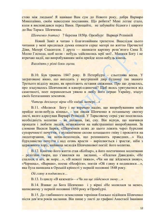 12. 12. стою між людьми! Я навіваю Вам сум до Нового року, добра Варваро Миколаївно, своїм невеселим посланням. Що робити? Мені легше стало, коли я висповідався перед Вами. Прощайте, не забувайте бідного і щирого до Вас Тараса Шевченка. Шевченко (читає) 7 березня 1850р. Оренбург Варварі Рєпніній Новий Завіт я читаю з благоговійним трепетом. Внаслідок цього читання у мені нродилася думка описати серце матері по життю Пречистої Діви, Матері Спасителя. І друга — написати картину розп’ятого Сина Її. Молю Господа, щоб коли - небудь здійснились мрії мої!.. Молюся Богу і не втрачаю надії, що випробуванням моїм прийде коли-небудь кінець. Виходять у різні боки сцени. В.10. Був травень 1847 року. В Петербурзі – сльотлива весна. У загратоване вікно, що виходить у внутрішній двір будинку так званого Третього відділу видно, як пролітають остання сніжинки. Про що думалось, про згадувалось Шевченкові в камері-одиночці? Щоб якось урятуватися від самотності, поет переноситься уявою в любу його серцю Україну, згадує своїх безталанних землячок. Читець декламує вірш «Не кидай матері…» В.11. «Молюся Богу і не втрачаю надію, що випробуванням моїм прийде коли-небудь кінець», - так писав Шевченко в останньому своєму листі, якого адресував Варварі Рєпніній. У Тарасовому серці уже поселилась необхідність молитви – як дихання, їжі, сну. Він відчув, що навчився прощати і любити людей, незважаючи на найстрашніші випробування. За словами Василя Барки, «Шевченків шлях до цього лежить через бурхливі суперечності почуттів, з вулканічною силою козацького гніву і прокляття на людотерзання, на катів-недолюдів, що розпинають праведних…» Над бурхливістю почуття і над огонь ярости – вкріплюється і зростає, ніби з церковного хору, найвища мелодія Шевченкової поезії: його молитва. В.12. Книгою його життя став «Кобзар», а його поетичними молитвами – релігійні твори, що з’явилися на засланні, - «Псалми Давидові», «Не спалося, а ніч, як море…», «В неволі тяжко», «Чи ми ще зійдемося знову», «Чернець», «Варнак», поема «Неофіти», поезія «Ой гляну я подивлюся…», яка була написана в Орській кріпості у першій половині 1848 року. Ой гляну я подивлюся… В.13. Із циклу «В казематі» - «Чи ми ще зійдемося знову…» В.14. Взиває до Бога Шевченко і у вірші «Не молилася за мене», написаному у першій половині 1850 року в Оренбурзі. В.15. До глибинного осмислення терпіння близько підійшов Шевченко після дев’яти років заслання. Він пише у листі до графині Анастасії Іванівни 12