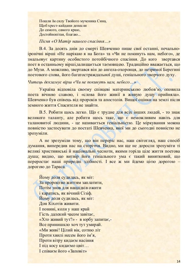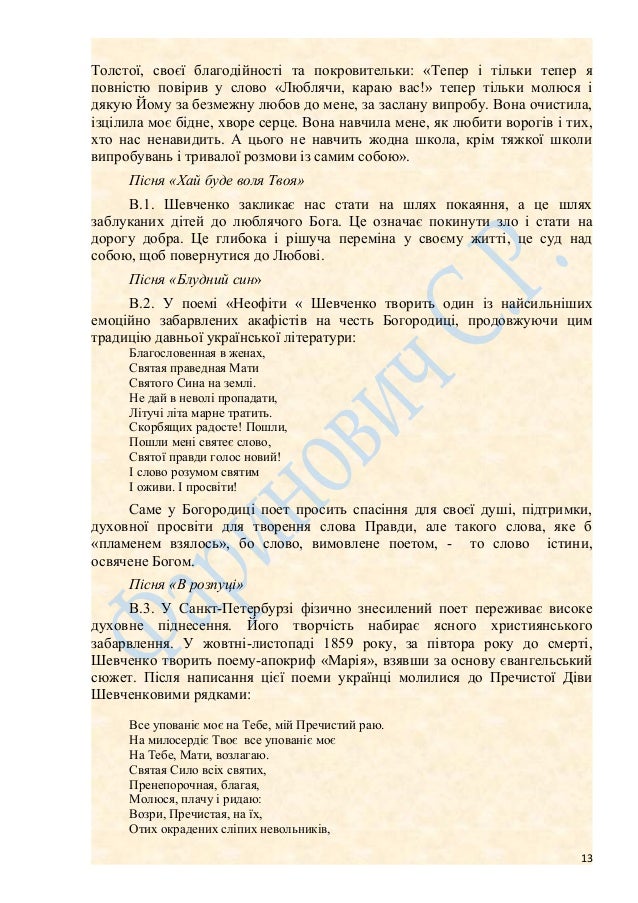 13. 13. Толстої, своєї благодійності та покровительки: «Тепер і тільки тепер я повністю повірив у слово «Люблячи, караю вас!» тепер тільки молюся і дякую Йому за безмежну любов до мене, за заслану випробу. Вона очистила, ізцілила моє бідне, хворе серце. Вона навчила мене, як любити ворогів і тих, хто нас ненавидить. А цього не навчить жодна школа, крім тяжкої школи випробувань і тривалої розмови із самим собою». Пісня «Хай буде воля Твоя» В.1. Шевченко закликає нас стати на шлях покаяння, а це шлях заблуканих дітей до люблячого Бога. Це означає покинути зло і стати на дорогу добра. Це глибока і рішуча переміна у своєму житті, це суд над собою, щоб повернутися до Любові. Пісня «Блудний син» В.2. У поемі «Неофіти « Шевченко творить один із найсильніших емоційно забарвлених акафістів на честь Богородиці, продовжуючи цим традицію давньої української літератури: Благословенная в женах, Святая праведная Мати Святого Сина на землі. Не дай в неволі пропадати, Літучі літа марне тратить. Скорбящих радосте! Пошли, Пошли мені святеє слово, Святої правди голос новий! І слово розумом святим І оживи. І просвіти! Саме у Богородиці поет просить спасіння для своєї душі, підтримки, духовної просвіти для творення слова Правди, але такого слова, яке б «пламенем взялось», бо слово, вимовлене поетом, - то слово істини, освячене Богом. Пісня «В розпуці» В.3. У Санкт-Петербурзі фізично знесилений поет переживає високе духовне піднесення. Його творчість набирає ясного християнського забарвлення. У жовтні-листопаді 1859 року, за півтора року до смерті, Шевченко творить поему-апокриф «Марія», взявши за основу євангельський сюжет. Після написання цієї поеми українці молилися до Пречистої Діви Шевченковими рядками: Все упованіє моє на Тебе, мій Пречистий раю. На милосердіє Твоє все упованіє моє На Тебе, Мати, возлагаю. Святая Сило всіх святих, Пренепорочная, благая, Молюся, плачу і ридаю: Возри, Пречистая, на їх, Отих окрадених сліпих невольників, 13