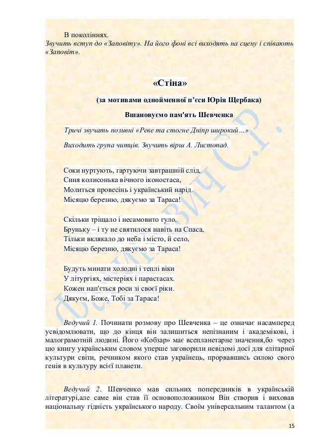 15. 15. В поколіннях. Звучить вступ до «Заповіту». На його фоні всі виходять на сцену і співають «Заповіт». «Стіна» (за мотивами однойменної п’єси Юрія Щербака) Вшановуємо пам'ять Шевченка Тричі звучать позивні «Реве та стогне Дніпр широкий…» Виходить група читців. Звучить вірш А. Листопад. Соки нуртують, гартуючи завтрашній слід, Синя колисонька вічного іконостаса, Молиться провесінь і український нарід. Місяцю березню, дякуємо за Тараса! Скільки тріщало і несамовито гуло, Бруньку – і ту не святилося навіть на Спаса, Тільки вклякало до неба і місто, й село, Місяцю березню, дякуємо за Тараса! Будуть минати холодні і теплі віки У літургіях, містеріях і парастасах. Кожен нап'ється роси зі своєї ріки. Дякуєм, Боже, Тобі за Тараса! Ведучий 1. Починати розмову про Шевченка – це означає насамперед усвідомлювати, що до кінця він залишиться непізнаним і академікові, і малограмотній людині. Його «Кобзар» має всепланетарне значення,бо через цю книгу українським словом уперше заговорили невідомі досі для елітарної культури світи, речником якого став українець, прорвавшись силою свого генія в культуру всієї планети. Ведучий 2. Шевченко мав сильних попередників в українській літературі,але саме він став її основоположником Він створив і виховав національну гідність українського народу. Своїм універсальним талантом (а 15
