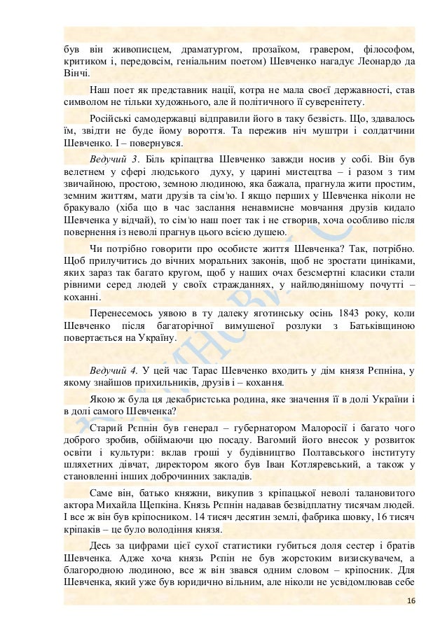 16. 16. був він живописцем, драматургом, прозаїком, гравером, філософом, критиком і, передовсім, геніальним поетом) Шевченко нагадує Леонардо да Вінчі. Наш поет як представник нації, котра не мала своєї державності, став символом не тільки художнього, але й політичного її суверенітету. Російські самодержавці відправили його в таку безвість. Що, здавалось їм, звідти не буде йому вороття. Та пережив ніч муштри і солдатчини Шевченко. І – повернувся. Ведучий 3. Біль кріпацтва Шевченко завжди носив у собі. Він був велетнем у сфері людського духу, у царині мистецтва – і разом з тим звичайною, простою, земною людиною, яка бажала, прагнула жити простим, земним життям, мати друзів та сім'ю. І якщо перших у Шевченка ніколи не бракувало (хіба що в час заслання ненавмисне мовчання друзів кидало Шевченка у відчай), то сім'ю наш поет так і не створив, хоча особливо після повернення із неволі прагнув цього всією душею. Чи потрібно говорити про особисте життя Шевченка? Так, потрібно. Щоб прилучитись до вічних моральних законів, щоб не зростати циніками, яких зараз так багато кругом, щоб у наших очах безсмертні класики стали рівними серед людей у своїх стражданнях, у найлюдянішому почутті – коханні. Перенесемось уявою в ту далеку яготинську осінь 1843 року, коли Шевченко після багаторічної вимушеної розлуки з Батьківщиною повертається на Україну. Ведучий 4. У цей час Тарас Шевченко входить у дім князя Рєпніна, у якому знайшов прихильників, друзів і – кохання. Якою ж була ця декабристська родина, яке значення її в долі України і в долі самого Шевченка? Старий Рєпнін був генерал – губернатором Малоросії і багато чого доброго зробив, обіймаючи цю посаду. Вагомий його внесок у розвиток освіти і культури: вклав гроші у будівництво Полтавського інституту шляхетних дівчат, директором якого був Іван Котляревський, а також у становленні інших доброчинних закладів. Саме він, батько княжни, викупив з кріпацької неволі талановитого актора Михайла Щепкіна. Князь Рєпнін надавав безвідплатну тисячам людей. І все ж він був кріпосником. 14 тисяч десятин землі, фабрика шовку, 16 тисяч кріпаків – це було володіння князя. Десь за цифрами цієї сухої статистики губиться доля сестер і братів Шевченка. Адже хоча князь Рєпін не був жорстоким визискувачем, а благородною людиною, все ж він звався одним словом – кріпосник. Для Шевченка, який уже був юридично вільним, але ніколи не усвідомлював себе 16