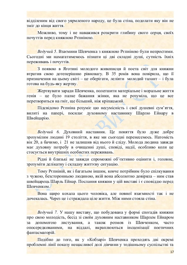 17. 17. відділеним від свого уярмленого народу, це була стіна, подолати яку він не зміг до кінця життя. Можливо, тому і не наважився розкрити глибину свого серця, своїх почуттів перед княжною Рєпніною. Ведучий 5. Взаємини Шевченка з княжною Рєпніною були непростими. Сьогодні ми намагатимемось пізнати ці дві складні душі, сутність їхніх переживань і почуттів. З появою в Яготині молодого живописця й поета світ для княжни втратив свою дотеперішню рівновагу. В 35 років вона повірила, що її призначення на цьому світі – це оберігати, леліяти молодий талант – і була готова на будь-яку жертву. Жертвувати заради Шевченка, полегшити матеріальне і моральне життя генія – це було палке бажання жінки, яка не розуміла, що це все перетвориться на гніт, ще більший, ніж кріпацький. Підсвідомо Рєпніна розуміє цю несумісність і свої душевні сум’яття, вилиті на папері, посилає духовному наставнику Шарлю Ейнару в Швейцарію. Ведучий 6. Духовний наставник. Це поняття було дуже добре зрозумілим людині 19 століття, в яке ми сьогодні перенесемось. Натомість вік 20, а бачимо, і 21 не залишив від нього й сліду. Молода людина завжди має духовну потребу в очищенні душі, сповіді, надії, особливо коли це стосується внутрішніх особистих переживань. Рідні й близькі не завжди спроможні об’єктивно оцінити і, головне, зрозуміти делікатну і складну життєву ситуацію. Тому Рєпніній, як і багатьом іншим, конче потрібним було спілкування з чужою, безсторонньою людиною, якій вона абсолютно довіряла – ним став швейцарець Шарль Ейнар. Послання княжни у цій виставі і є сповіддю перед Шевченком. Вона щиро кохала цього чоловіка, але повної взаємності так і не дочекалась. Через це і страждала ціле життя. Між ними стояла стіна. Ведучий 7. У нашу виставу, що побудована у формі спогадів княжни про свою молодість, бесід зі своїм духовним наставником Шарлем Ейнаром за допомогою листування, а також розмов із Шевченком, часто опосередкованими, на віддалі, вкраплюються інсценізації поетичних фантасмагорій. Подібно до того, як у «Кобзарі» Шевченка проходять дві окремі проблемні лінії показу нещасливої долі дівчини у тодішньому суспільстві та 17