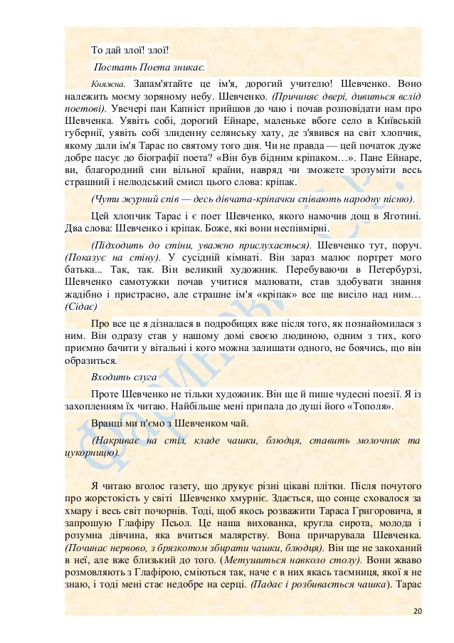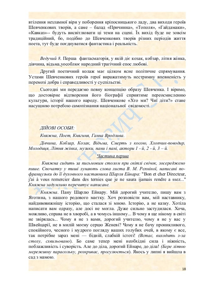 18. 18. втілення незламної віри у поборення кріпосницького ладу, два виходи героїв Шевченкових творів, а саме – балад «Причинна», «Тополя», «Гайдамаки», «Кавказ»-- будуть висвітлювати ці теми на сцені. Їх вихід буде не зовсім традиційний, бо, подібно до Шевченкових творів різних періодів життя поета, тут буде поєднуватися фантастика і реальність. Ведучий 8. Перша фантасмагорія, у якій діє козак, кобзар, літня жінка, дівчина, відьма,уособлює народний трагічний епос любові. Другий поетичний колаж має цілком ясне політичне спрямування. Устами Шевченкових героїв герої виражатимуть нестримну впевненість у перемозі добра і справедливості у суспільстві. Сьогодні ми передаємо певну концепцію образу Шевченка. І віримо, що достовірне відтворення його біографії сприятиме переосмисленню культури, історії нашого народу. Шевченкове «Хто ми? Чиї діти?» стане насущною потребою самопізнання національної свідомості. ДІЙОВІ ОСОБИ: Княжна, Поет, Княгиня, Ганна Вродлива. Дівчина, Кобзар, Козак, Відьма, Смерть з косою, Хлопчик-поводир, Молодиця, Літня жінка, музики, пани і пані, актори 1 - й, 2 - й, 3 – й. Частина перша Княжна сидить за письмовим столом при світлі свічок, зосереджено пише. Спочатку у тиші лунають слова листа В. М. Рєпніної, написані по- французьки до її духовного наставника Шарля Ейнара: "Bon et cher Directeur, j'ai à vous remercier dans des ternies que je ne saura ijamais rendre a ssez..." Княжна задумливо перечитує написане. Княжна. Пану Шарлю Ейнару. Мій дорогий учителю, пишу вам з Яготина, з нашого родового маєтку. Хоч розповісти вам, мій наставнику, найдивовижнішу історію, що сталася зі мною. Історію, а не казку. Хотіла написати вам одразу, але досі не могла. Дуже сильно застудилася. Хоча, можливо, справа не в хворобі, а в чомусь іншому... В чому я ще нікому в світі не звірялась... Чому я не з вами, дорогий учителю, чому я не у вас у Швейцарії, не в милій моєму серцю Женеві? Чому я не бачу проникливого, спокійного, чесного і мудрого погляду ваших голубих очей, в якому є все, так потрібне зараз мені — бідній, слабкій істоті! (Встає, виходить з-за столу, схвильовано). Бо саме тепер мені необхідні сила і ніжність, поблажливість і суворість. Але до діла, дорогий Ейнаре, до діла! (Бере літню мереживну парасольку, розкриває, прогулюється). Якось у липні я вийшла в сад з мамою. 18