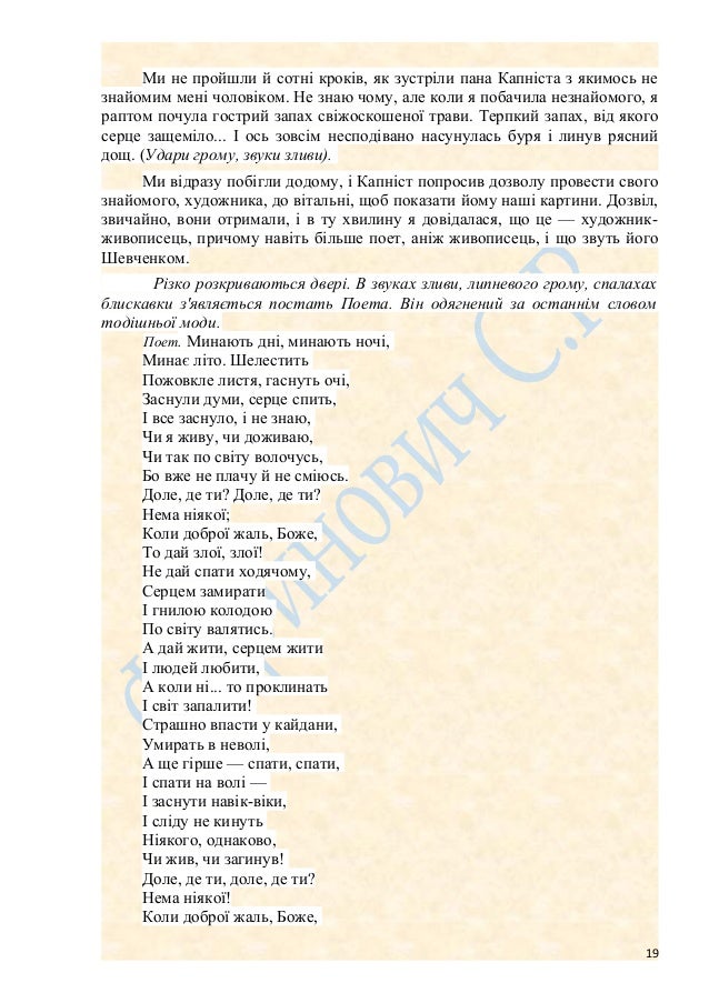 19. 19. Ми не пройшли й сотні кроків, як зустріли пана Капніста з якимось не знайомим мені чоловіком. Не знаю чому, але коли я побачила незнайомого, я раптом почула гострий запах свіжоскошеної трави. Терпкий запах, від якого серце защеміло... І ось зовсім несподівано насунулась буря і линув рясний дощ. (Удари грому, звуки зливи). Ми відразу побігли додому, і Капніст попросив дозволу провести свого знайомого, художника, до вітальні, щоб показати йому наші картини. Дозвіл, звичайно, вони отримали, і в ту хвилину я довідалася, що це — художник- живописець, причому навіть більше поет, аніж живописець, і що звуть його Шевченком. Різко розкриваються двері. В звуках зливи, липневого грому, спалахах блискавки з'являється постать Поета. Він одягнений за останнім словом тодішньої моди. Поет. Минають дні, минають ночі, Минає літо. Шелестить Пожовкле листя, гаснуть очі, Заснули думи, серце спить, І все заснуло, і не знаю, Чи я живу, чи доживаю, Чи так по світу волочусь, Бо вже не плачу й не сміюсь. Доле, де ти? Доле, де ти? Нема ніякої; Коли доброї жаль, Боже, То дай злої, злої! Не дай спати ходячому, Серцем замирати І гнилою колодою По світу валятись. А дай жити, серцем жити І людей любити, А коли ні... то проклинать І світ запалити! Страшно впасти у кайдани, Умирать в неволі, А ще гірше — спати, спати, І спати на волі — І заснути навік-віки, І сліду не кинуть Ніякого, однаково, Чи жив, чи загинув! Доле, де ти, доле, де ти? Нема ніякої! Коли доброї жаль, Боже, 19