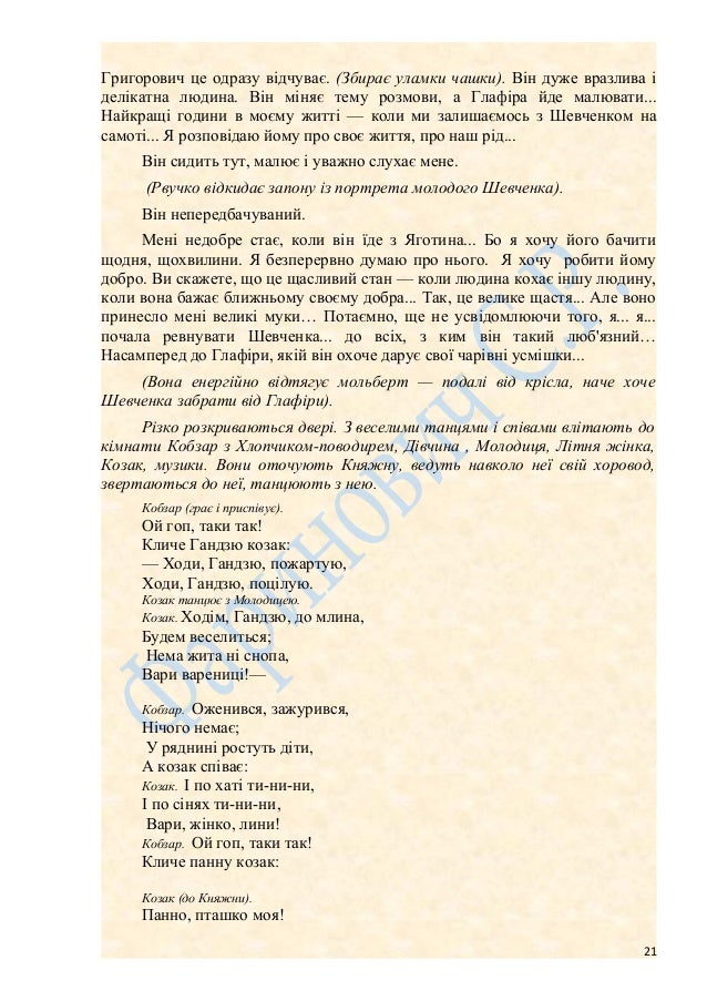 21. 21. Григорович це одразу відчуває. (Збирає уламки чашки). Він дуже вразлива і делікатна людина. Він міняє тему розмови, а Глафіра йде малювати... Найкращі години в моєму житті — коли ми залишаємось з Шевченком на самоті... Я розповідаю йому про своє життя, про наш рід... Він сидить тут, малює і уважно слухає мене. (Рвучко відкидає запону із портрета молодого Шевченка). Він непередбачуваний. Мені недобре стає, коли він їде з Яготина... Бо я хочу його бачити щодня, щохвилини. Я безперервно думаю про нього. Я хочу робити йому добро. Ви скажете, що це щасливий стан — коли людина кохає іншу людину, коли вона бажає ближньому своєму добра... Так, це велике щастя... Але воно принесло мені великі муки… Потаємно, ще не усвідомлюючи того, я... я... почала ревнувати Шевченка... до всіх, з ким він такий люб'язний… Насамперед до Глафіри, якій він охоче дарує свої чарівні усмішки... (Вона енергійно відтягує мольберт — подалі від крісла, наче хоче Шевченка забрати від Глафіри). Різко розкриваються двері. З веселими танцями і співами влітають до кімнати Кобзар з Хлопчиком-поводирем, Дівчина , Молодиця, Літня жінка, Козак, музики. Вони оточують Княжну, ведуть навколо неї свій хоровод, звертаються до неї, танцюють з нею. Кобзар (грає і приспівує). Ой гоп, таки так! Кличе Гандзю козак: — Ходи, Гандзю, пожартую, Ходи, Гандзю, поцілую. Козак танцює з Молодицею. Козак. Ходім, Гандзю, до млина, Будем веселиться; Нема жита ні снопа, Вари варениці!— Кобзар. Оженився, зажурився, Нічого немає; У ряднині ростуть діти, А козак співає: Козак. І по хаті ти-ни-ни, І по сінях ти-ни-ни, Вари, жінко, лини! Кобзар. Ой гоп, таки так! Кличе панну козак: Козак (до Княжни). Панно, пташко моя! 21