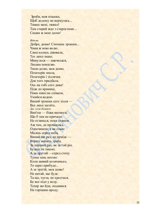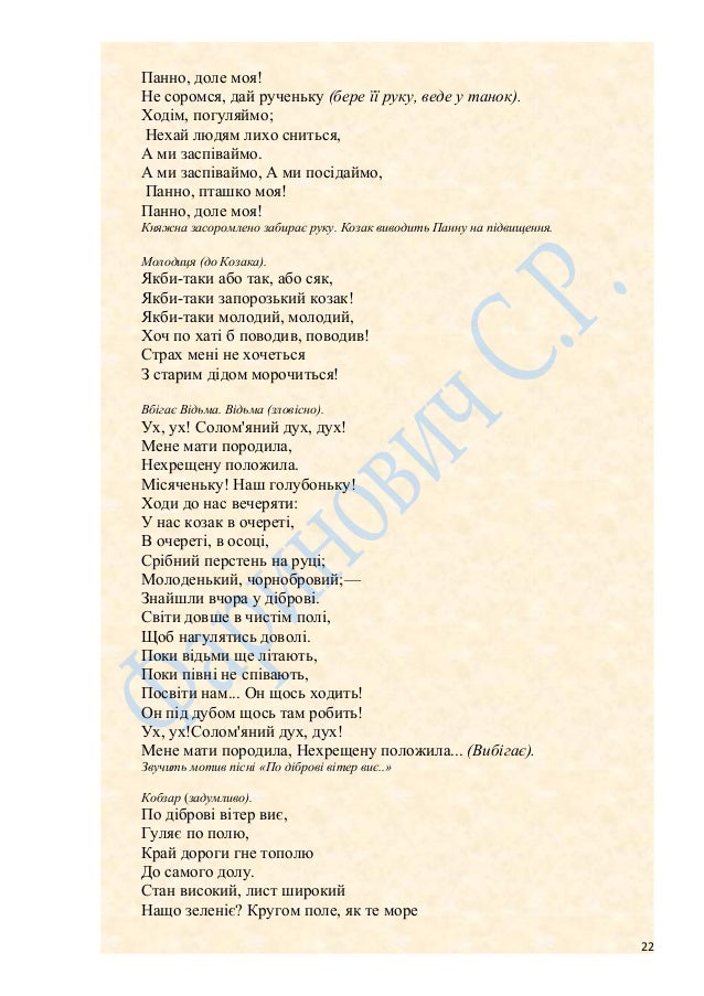 22. 22. Панно, доле моя! Не соромся, дай рученьку (бере її руку, веде у танок). Ходім, погуляймо; Нехай людям лихо сниться, А ми заспіваймо. А ми заспіваймо, А ми посідаймо, Панно, пташко моя! Панно, доле моя! Княжна засоромлено забирає руку. Козак виводить Панну на підвищення. Молодиця (до Козака). Якби-таки або так, або сяк, Якби-таки запорозький козак! Якби-таки молодий, молодий, Хоч по хаті б поводив, поводив! Страх мені не хочеться З старим дідом морочиться! Вбігає Відьма. Відьма (зловісно). Ух, ух! Солом'яний дух, дух! Мене мати породила, Нехрещену положила. Місяченьку! Наш голубоньку! Ходи до нас вечеряти: У нас козак в очереті, В очереті, в осоці, Срібний перстень на руці; Молоденький, чорнобровий;— Знайшли вчора у діброві. Світи довше в чистім полі, Щоб нагулятись доволі. Поки відьми ще літають, Поки півні не співають, Посвіти нам... Он щось ходить! Он під дубом щось там робить! Ух, ух!Солом'яний дух, дух! Мене мати породила, Нехрещену положила... (Вибігає). Звучить мотив пісні «По діброві вітер виє..» Кобзар (задумливо). По діброві вітер виє, Гуляє по полю, Край дороги гне тополю До самого долу. Стан високий, лист широкий Нащо зеленіє? Кругом поле, як те море 22