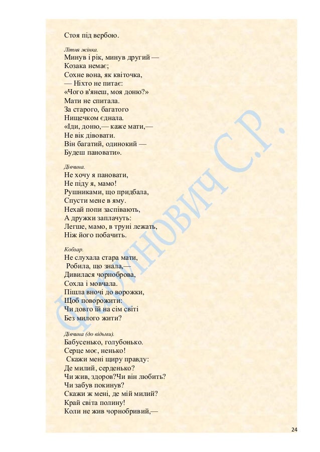 24. 24. Стоя під вербою. Літня жінка. Минув і рік, минув другий — Козака немає; Сохне вона, як квіточка, — Ніхто не питає: «Чого в'янеш, моя доню?» Мати не спитала. За старого, багатого Нищечком єднала. «Іди, доню,— каже мати,— Не вік дівовати. Він багатий, одинокий — Будеш пановати». Дівчина. Не хочу я пановати, Не піду я, мамо! Рушниками, що придбала, Спусти мене в яму. Нехай попи заспівають, А дружки заплачуть: Легше, мамо, в труні лежать, Ніж його побачить. Кобзар. Не слухала стара мати, Робила, що знала,— Дивилася чорноброва, Сохла і мовчала. Пішла вночі до ворожки, Щоб поворожити: Чи довго їй на сім світі Без милого жити? Дівчина (до відьми). Бабусенько, голубонько. Серце моє, ненько! Скажи мені щиру правду: Де милий, серденько? Чи жив, здоров?Чи він любить? Чи забув покинув? Скажи ж мені, де мій милий? Край світа полину! Коли не жив чорнобривий,— 24