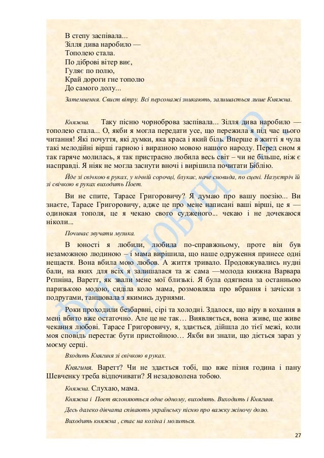 27. 27. В степу заспівала... Зілля дива наробило — Тополею стала. По діброві вітер виє, Гуляє по полю, Край дороги гне тополю До самого долу... Затемнення. Свист вітру. Всі персонажі зникають, залишається лише Княжна. Княжна. Таку пісню чорноброва заспівала... Зілля дива наробило — тополею стала... О, якби я могла передати усе, що пережила я під час цього читання! Які почуття, які думки, яка краса і який біль. Вперше в житті я чула такі мелодійні вірші гарною і виразною мовою нашого народу. Перед сном я так гаряче молилась, я так пристрасно любила весь світ – чи не більше, ніж є насправді. Я ніяк не могла заснути вночі і вирішила почитати Біблію. Йде зі свічкою в руках, у нічній сорочці, блукає, наче сновида, по сцені. Назустріч їй зі свічкою в руках виходить Поет. Ви не спите, Тарасе Григоровичу? Я думаю про вашу поезію... Ви знаєте, Тарасе Григоровичу, адже це про мене написані ваші вірші, це я — одинокая тополя, це я чекаю свого судженого... чекаю і не дочекаюся ніколи... Починає звучати музика. В юності я любили, любила по-справжньому, проте він був незаможною людиною – і мама вирішила, що наше одруження принесе одні нещастя. Вона вбила мою любов. А життя тривало. Продовжувались нудні бали, на яких для всіх я залишалася та ж сама —молода княжна Варвара Рєпніна, Варетт, як звали мене мої близькі. Я була одягнена за останньою паризькою модою, сиділа коло мама, розмовляла про вбрання і зачіски з подругами, танцювала з якимись дурнями. Роки проходили безбарвні, сірі та холодні. Здалося, що віру в кохання в мені вбито вже остаточно. Але це не так… Виявляється, вона живе, ще живе чекання любові. Тарасе Григоровичу, я, здається, дійшла до тієї межі, коли моя сповідь перестає бути пристойною… Якби ви знали, що діється зараз у моєму серці. Входить Княгиня зі свічкою в руках. Княгиня. Варетт? Чи не здається тобі, що вже пізня година і пану Шевченку треба відпочивати? Я незадоволена тобою. Княжна. Слухаю, мама. Княжна і Поет вклоняються одне одному, виходять. Виходить і Княгиня. Десь далеко дівчата співають українську пісню про важку жіночу долю. Виходить княжна , стає на коліна і молиться. 27