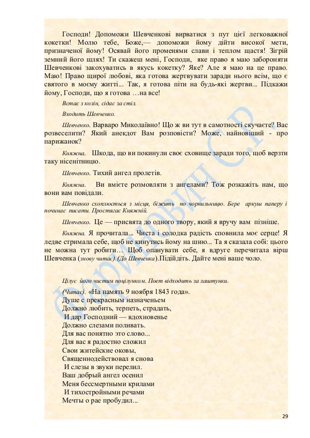29. 29. Господи! Допоможи Шевченкові вирватися з пут цієї легковажної кокетки! Молю тебе, Боже,— допоможи йому дійти високої мети, призначеної йому! Осявай його променями слави і теплом щастя! Зігрій земний його шлях! Ти скажеш мені, Господи, яке право я маю забороняти Шевченкові закохуватись в якусь кокетку? Яке? Але я маю на це право. Маю! Право щирої любові, яка готова жертвувати заради нього всім, що є святого в моєму житті... Так, я готова піти на будь-які жертви... Підкажи йому, Господи, що я готова …на все! Встає з колін, сідає за стіл. Входить Шевченко. Шевченко. Варваро Миколаївно! Що ж ви тут в самотності скучаєте? Вас розвеселити? Який анекдот Вам розповісти? Може, найновіший - про парижанок? Княжна. Шкода, що ви покинули своє сховище заради того, щоб верзти таку нісенітницю. Шевченко. Тихий ангел пролетів. Княжна. Ви вмієте розмовляти з ангелами? Тож розкажіть нам, що вони вам повідали. Шевченко схоплюється з місця, біжить по чорнильницю. Бере аркуш паперу і починає писати. Простягає Княжній. Шевченко. Це — присвята до одного твору, який я вручу вам пізніше. Княжна. Я прочитала... Чиста і солодка радість сповнила моє серце! Я ледве стримала себе, щоб не кинутись йому на шию... Та я сказала собі: цього не можна тут робити… Щоб опанувати себе, я вдруге перечитала вірш Шевченка (знову читає).(До Шевченка).Підійдіть. Дайте мені ваше чоло. Цілує його чистим поцілунком. Поет відходить за лаштунки. (Читає). «На память 9 ноября 1843 года». Душе с прекрасным назначеньем Должно любить, терпеть, страдать, И дар Господний — вдохновенье Должно слезами поливать. Для вас понятно это слово... Для вас я радостно сложил Свои житейские оковы, Священнодействовал я снова И слезы в звуки перелил. Ваш добрый ангел осенил Меня бессмертными крилами И тихостройными речами Мечты о рае пробудил... 29