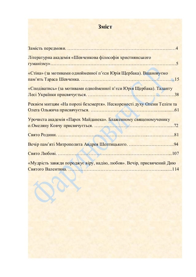 3. 3. Зміст Замість передмови. …………………………………………………………..…4 Літературна академія «Шевченкова філософія християнського гуманізму»…………………………………………………………………….…5 «Стіна» (за мотивами однойменної п’єси Юрія Щербака). Вшановуємо пам’ять Тараса Шевченка. ………………………………………………….…15 «Сподіватись» (за мотивами однойменної п’єси Юрія Щербака). Таланту Лесі Українки присвячується. …………………………………………..…….38 Реквієм митцям «На порозі безсмертя». Нескореності духу Олени Теліги та Олега Ольжича присвячується. …………………………………….…............61 Урочиста академія «Парох Майданека». Блаженному священомученику о.Омеляну Ковчу присвячується. ………………………………………….....72 Свято Родини. …………………………………………………..……………...81 Вечір пам’яті Митрополита Андрея Шептицького. ………….……………..94 Свято Любові. ………………………………………………………………...107 «Мудрість завжди породжує віру, надію, любов». Вечір, присвячений Дню Святого Валентина. ……………………………………………………..........114