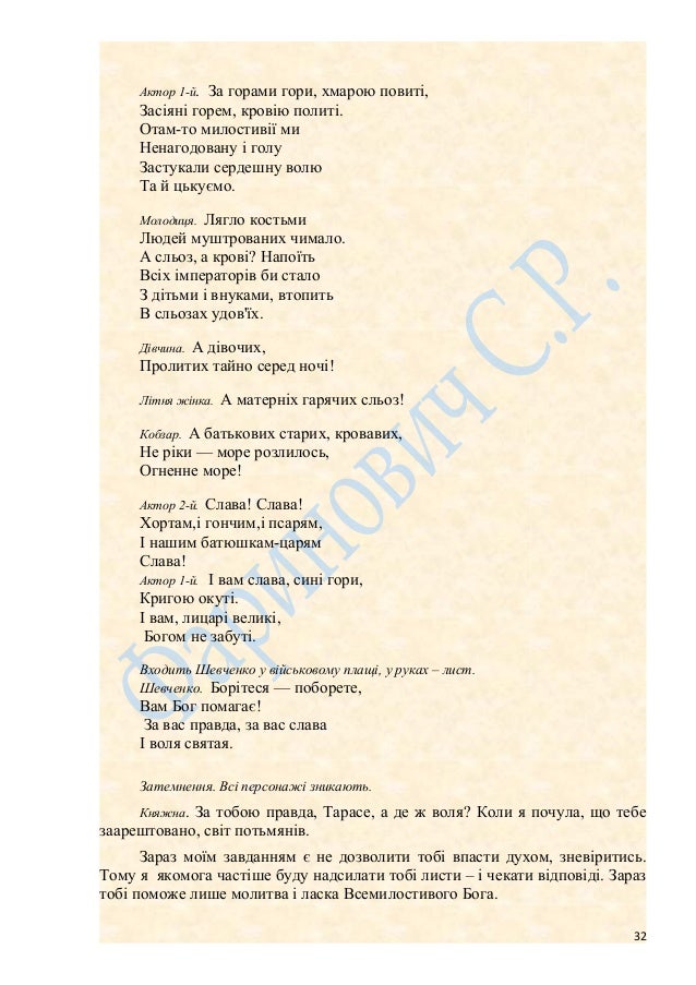 32. 32. Актор 1-й. За горами гори, хмарою повиті, Засіяні горем, кровію политі. Отам-то милостивії ми Ненагодовану і голу Застукали сердешну волю Та й цькуємо. Молодиця. Лягло костьми Людей муштрованих чимало. А сльоз, а крові? Напоїть Всіх імператорів би стало З дітьми і внуками, втопить В сльозах удов'їх. Дівчина. А дівочих, Пролитих тайно серед ночі! Літня жінка. А матерніх гарячих сльоз! Кобзар. А батькових старих, кровавих, Не ріки — море розлилось, Огненне море! Актор 2-й. Слава! Слава! Хортам,і гончим,і псарям, І нашим батюшкам-царям Слава! Актор 1-й. І вам слава, сині гори, Кригою окуті. І вам, лицарі великі, Богом не забуті. Входить Шевченко у військовому плащі, у руках – лист. Шевченко. Борітеся — поборете, Вам Бог помагає! За вас правда, за вас слава І воля святая. Затемнення. Всі персонажі зникають. Княжна. За тобою правда, Тарасе, а де ж воля? Коли я почула, що тебе заарештовано, світ потьмянів. Зараз моїм завданням є не дозволити тобі впасти духом, зневіритись. Тому я якомога частіше буду надсилати тобі листи – і чекати відповіді. Зараз тобі поможе лише молитва і ласка Всемилостивого Бога. 32