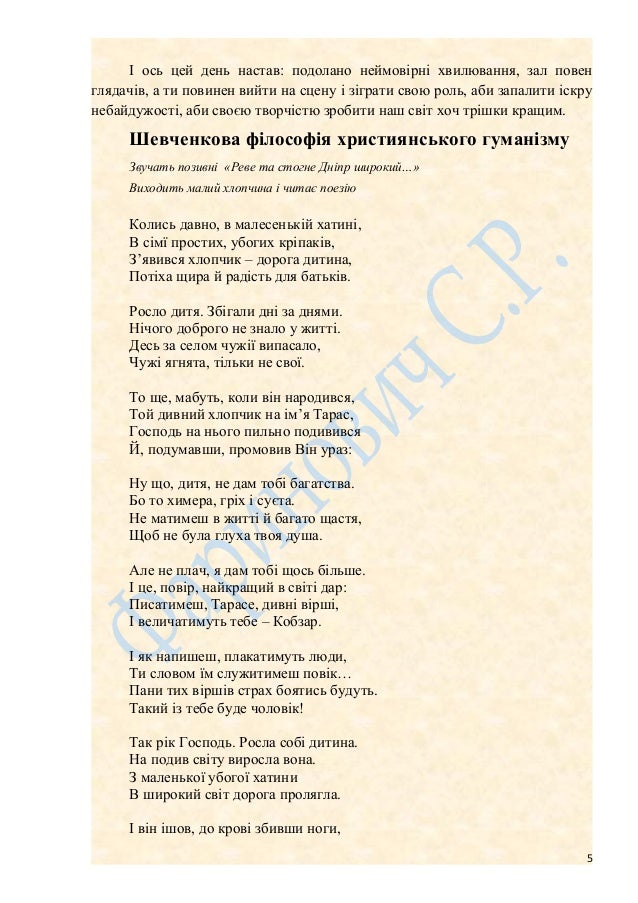 5. 5. І ось цей день настав: подолано неймовірні хвилювання, зал повен глядачів, а ти повинен вийти на сцену і зіграти свою роль, аби запалити іскру небайдужості, аби своєю творчістю зробити наш світ хоч трішки кращим. Шевченкова філософія християнського гуманізму Звучать позивні «Реве та стогне Дніпр широкий…» Виходить малий хлопчина і читає поезію Колись давно, в малесенькій хатині, В сімї простих, убогих кріпаків, З’явився хлопчик – дорога дитина, Потіха щира й радість для батьків. Росло дитя. Збігали дні за днями. Нічого доброго не знало у житті. Десь за селом чужії випасало, Чужі ягнята, тільки не свої. То ще, мабуть, коли він народився, Той дивний хлопчик на ім’я Тарас, Господь на нього пильно подивився Й, подумавши, промовив Він ураз: Ну що, дитя, не дам тобі багатства. Бо то химера, гріх і суєта. Не матимеш в житті й багато щастя, Щоб не була глуха твоя душа. Але не плач, я дам тобі щось більше. І це, повір, найкращий в світі дар: Писатимеш, Тарасе, дивні вірші, І величатимуть тебе – Кобзар. І як напишеш, плакатимуть люди, Ти словом їм служитимеш повік… Пани тих віршів страх боятись будуть. Такий із тебе буде чоловік! Так рік Господь. Росла собі дитина. На подив світу виросла вона. З маленької убогої хатини В широкий світ дорога пролягла. І він ішов, до крові збивши ноги, 5