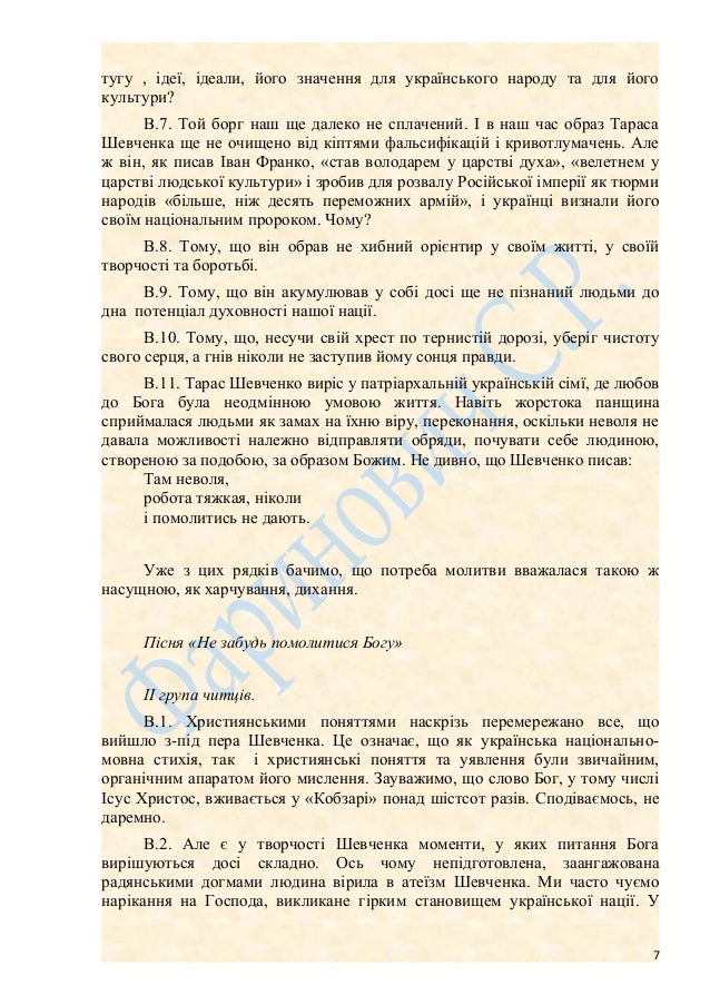 7. 7. тугу , ідеї, ідеали, його значення для українського народу та для його культури? В.7. Той борг наш ще далеко не сплачений. І в наш час образ Тараса Шевченка ще не очищено від кіптями фальсифікацій і кривотлумачень. Але ж він, як писав Іван Франко, «став володарем у царстві духа», «велетнем у царстві людської культури» і зробив для розвалу Російської імперії як тюрми народів «більше, ніж десять переможних армій», і українці визнали його своїм національним пророком. Чому? В.8. Тому, що він обрав не хибний орієнтир у своїм житті, у своїй творчості та боротьбі. В.9. Тому, що він акумулював у собі досі ще не пізнаний людьми до дна потенціал духовності нашої нації. В.10. Тому, що, несучи свій хрест по тернистій дорозі, уберіг чистоту свого серця, а гнів ніколи не заступив йому сонця правди. В.11. Тарас Шевченко виріс у патріархальній українській сімї, де любов до Бога була неодмінною умовою життя. Навіть жорстока панщина сприймалася людьми як замах на їхню віру, переконання, оскільки неволя не давала можливості належно відправляти обряди, почувати себе людиною, створеною за подобою, за образом Божим. Не дивно, що Шевченко писав: Там неволя, робота тяжкая, ніколи і помолитись не дають. Уже з цих рядків бачимо, що потреба молитви вважалася такою ж насущною, як харчування, дихання. Пісня «Не забудь помолитися Богу» ІІ група читців. В.1. Християнськими поняттями наскрізь перемережано все, що вийшло з-під пера Шевченка. Це означає, що як українська національно- мовна стихія, так і християнські поняття та уявлення були звичайним, органічним апаратом його мислення. Зауважимо, що слово Бог, у тому числі Ісус Христос, вживається у «Кобзарі» понад шістсот разів. Сподіваємось, не даремно. В.2. Але є у творчості Шевченка моменти, у яких питання Бога вирішуються досі складно. Ось чому непідготовлена, заангажована радянськими догмами людина вірила в атеїзм Шевченка. Ми часто чуємо нарікання на Господа, викликане гірким становищем української нації. У 7
