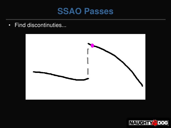201. 201. Half Volume = Fully Unoccluded</li></li></ul><li>SSAO Passes<br /><ul><li>Start with a point</li></li></ul><li>SSAO Passes<br /><ul><li>And sample pairs of points.</li></li></ul><li>SSAO Passes<br /><ul><li>What if we have an occluder?</li></li></ul><li>SSAO Passes<br /><ul><li>What if we have an occluder?</li></li></ul><li>SSAO Passes<br /><ul><li>We lose depth info.</li></li></ul><li>SSAO Passes<br /><ul><li>We could call it occluded.</li></li></ul><li>SSAO Passes<br /><ul><li>But, is that correct? Maybe not.</li></li></ul><li>SSAO Passes<br /><ul><li>Let's choose a cutoff, and mark the pair as invalid.</li></li></ul><li>SSAO Passes<br /><ul><li>Sample pattern?</li></li></ul><li>SSAO Passes<br /><ul><li>Sample pattern. Discard in pairs.</li></li></ul><li>SSAO Passes<br /><ul><li>Note the single light outline.</li></li></ul><li>SSAO Passes<br /><ul><li>Find discontinuties...</li></li></ul><li>SSAO Passes<br /><ul><li>Find discontinuties...</li></li></ul><li>SSAO Passes<br /><ul><li>Find discontinuties...</li></li></ul><li>SSAO Passes<br /><ul><li>Find discontinuties...</li></li></ul><li>SSAO Passes<br /><ul><li>...and dilate at discontinuties. Here is original.</li></li></ul><li>SSAO Passes<br /><ul><li>After X dilate.</li></li></ul><li>SSAO Passes<br /><ul><li>After Y dilate. And the light outline is gone.</li></li></ul><li>SSAO Passes<br /><ul><li>And do a gaussian blur.</li></li></ul><li>SSAO Passes<br /><ul><li>Final</li></li></ul><li>Artifacts<br />White Outline<br />Crossing Pattern<br />Depth Discontinuities<br />