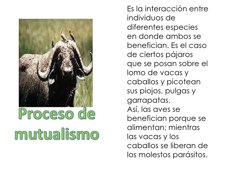 3. 3. Es la interacción entreindividuos dediferentes especiesen donde ambos sebenefician. Es el casode ciertos pájarosque se posan sobre ellomo de vacas ycaballos y picoteansus piojos, pulgas ygarrapatas.Así, las aves sebenefician porque sealimentan; mientraslas vacas y loscaballos se liberan delos molestos parásitos.