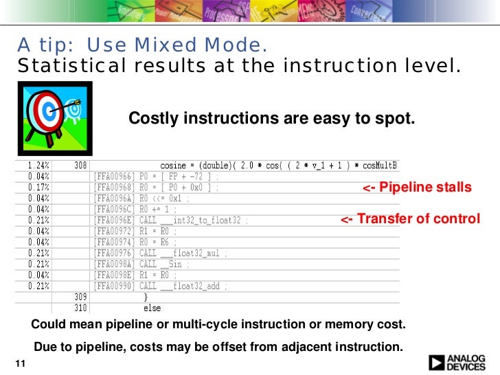 11. 11. A tip: Use Mixed Mode. Statistical results at the instruction level. Costly instructions are easy to spot. <- Pipeline stalls <- Transfer of control Could mean pipeline or multi-cycle instruction or memory cost. Due to pipeline, costs may be offset from adjacent instruction. 11