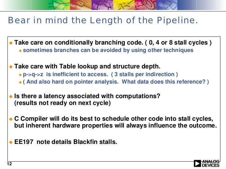 12. 12. Bear in mind the Length of the Pipeline. Take care on conditionally branching code. ( 0, 4 or 8 stall cycles ) sometimes branches can be avoided by using other techniques Take care with Table lookup and structure depth. p->q->z is inefficient to access. ( 3 stalls per indirection ) ( And also hard on pointer analysis. What data does this reference? ) Is there a latency associated with computations? (results not ready on next cycle) C Compiler will do its best to schedule other code into stall cycles, but inherent hardware properties will always influence the outcome. EE197 note details Blackfin stalls. 12