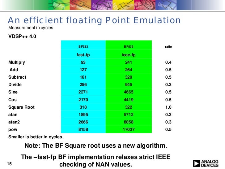 15. 15. An efficient floating Point Emulation Measurement in cycles VDSP++ 4.0 BF533 BF533 ratio fast-fp ieee-fp Multiply 93 241 0.4 Add 127 264 0.5 Subtract 161 329 0.5 Divide 256 945 0.3 Sine 2271 4665 0.5 Cos 2170 4419 0.5 Square Root 318 322 1.0 atan 1895 5712 0.3 atan2 2666 8058 0.3 pow 8158 17037 0.5 Smaller is better in cycles. Note: The BF Square root uses a new algorithm. The –fast-fp BF implementation relaxes strict IEEE 15 checking of NAN values.