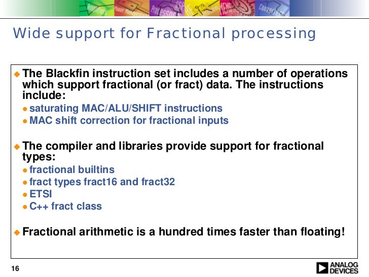 16. 16. Wide support for Fractional processing The Blackfin instruction set includes a number of operations which support fractional (or fract) data. The instructions include: saturating MAC/ALU/SHIFT instructions MAC shift correction for fractional inputs The compiler and libraries provide support for fractional types: fractional builtins fract types fract16 and fract32 ETSI C++ fract class Fractional arithmetic is a hundred times faster than floating! 16