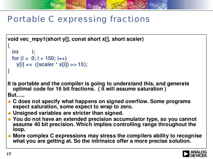 17. 17. Portable C expressing fractions void vec_mpy1(short y[], const short x[], short scaler) { int i; for (i = 0; i < 150; i++) y[i] += ((scaler * x[i]) >> 15); } It is portable and the compiler is going to understand this, and generate optimal code for 16 bit fractions. ( it will assume saturation ) But….. C does not specify what happens on signed overflow. Some programs expect saturation, some expect to wrap to zero. Unsigned variables are stricter than signed. You do not have an extended precision accumulator type, so you cannot assume 40 bit precision. Which implies controlling range throughout the loop. More complex C expressions may stress the compilers ability to recognise what you are getting at. So the intrinsics offer a more precise solution. 17