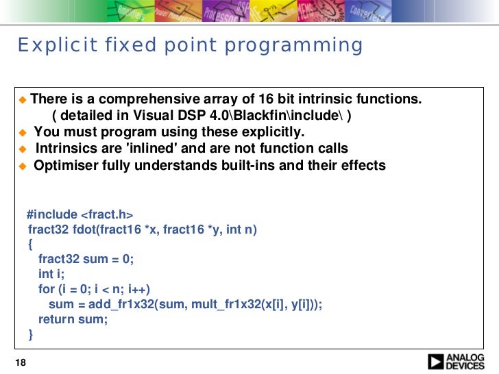 18. 18. Explicit fixed point programming There is a comprehensive array of 16 bit intrinsic functions. ( detailed in Visual DSP 4.0Blackfininclude ) You must program using these explicitly. Intrinsics are 'inlined' and are not function calls Optimiser fully understands built-ins and their effects #include <fract.h> fract32 fdot(fract16 *x, fract16 *y, int n) { fract32 sum = 0; int i; for (i = 0; i < n; i++) sum = add_fr1x32(sum, mult_fr1x32(x[i], y[i])); return sum; } 18