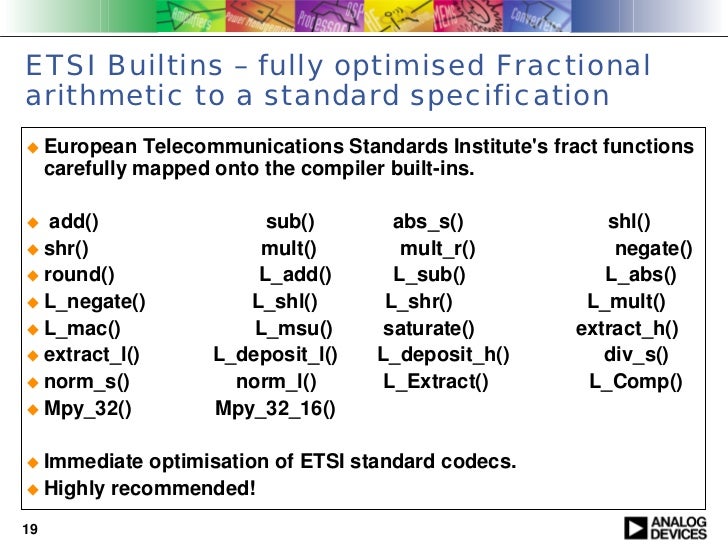 19. 19. ETSI Builtins – fully optimised Fractional arithmetic to a standard specification European Telecommunications Standards Institute's fract functions carefully mapped onto the compiler built-ins. add() sub() abs_s() shl() shr() mult() mult_r() negate() round() L_add() L_sub() L_abs() L_negate() L_shl() L_shr() L_mult() L_mac() L_msu() saturate() extract_h() extract_l() L_deposit_l() L_deposit_h() div_s() norm_s() norm_l() L_Extract() L_Comp() Mpy_32() Mpy_32_16() Immediate optimisation of ETSI standard codecs. Highly recommended! 19