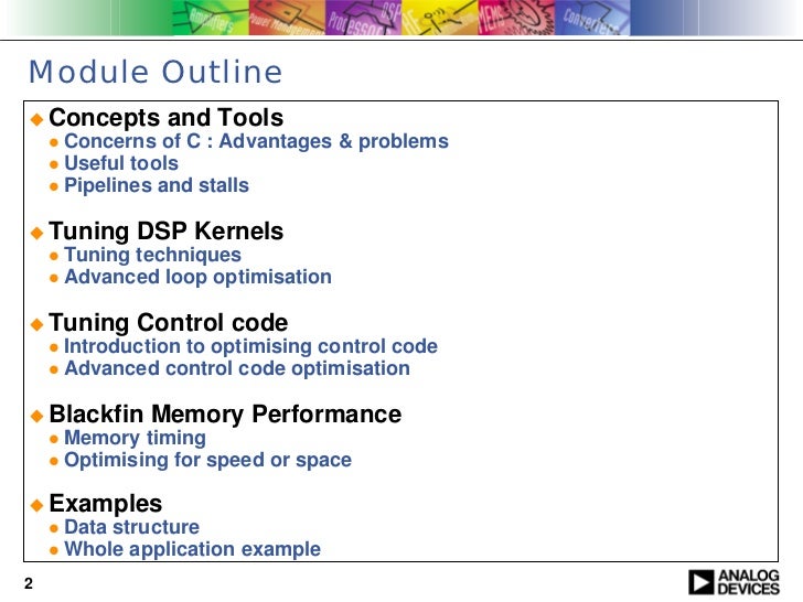 1. 1. About this Module This module introduces concepts, tools and approaches to optimising Blackfin C applications. It highlights the problems and opportunities that can lead to potentially significant performance improvements. The course will look at the available tools, such as the Statistical profiler and then review techniques for handling Control code, DSP kernel code and memory, finishing with an example. The material covers a wide range from automatic optimisation to detailed rewriting of C expressions. 1